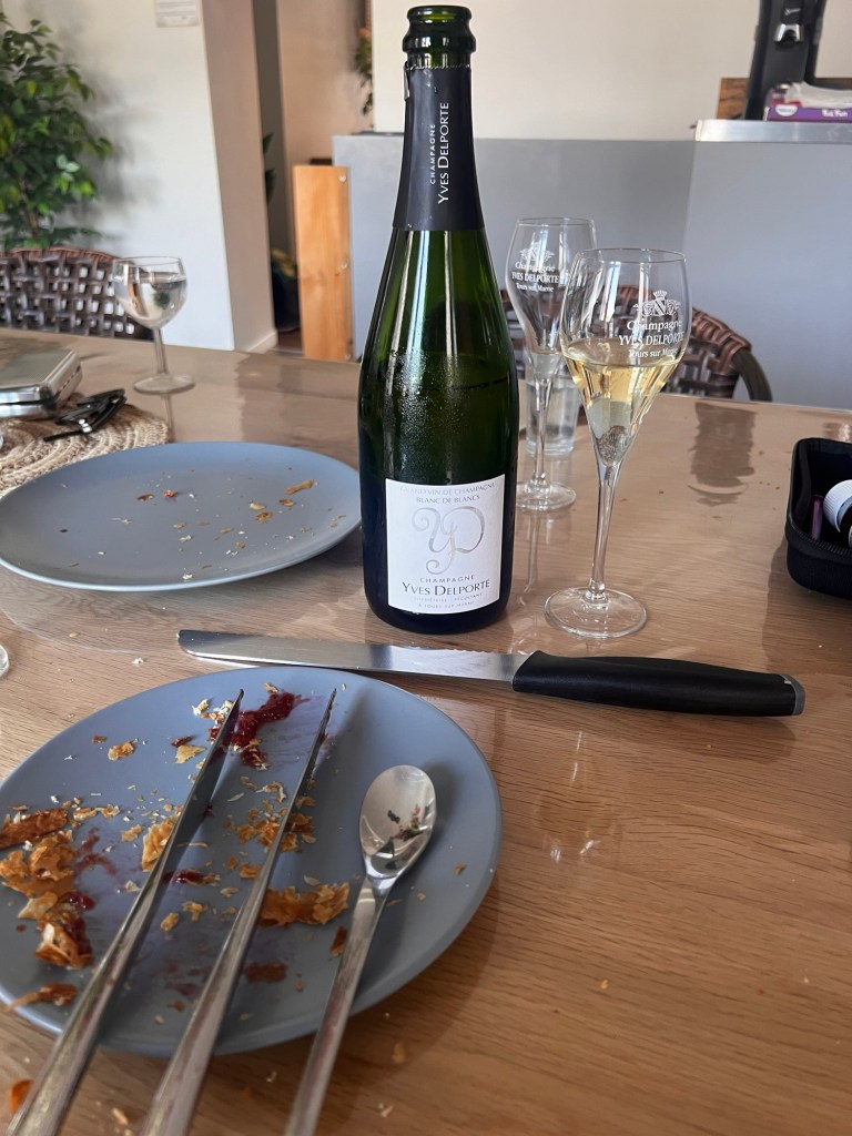 Sunday was our main day in Epernay and it seemed inappropriate not to start the day in the spirit of the region, so we opened a bottle of blanc en blancs, champagne with only Chardonnay (white grapes and white juice) to accompany our fresh croissant and pain au chocolate breakfast spread sourced from the local bakery with a queue long outside the door! Our little one tasked me with searching the top shelf whilst she inspected the bottom to make sure we didn’t miss any good cake options!